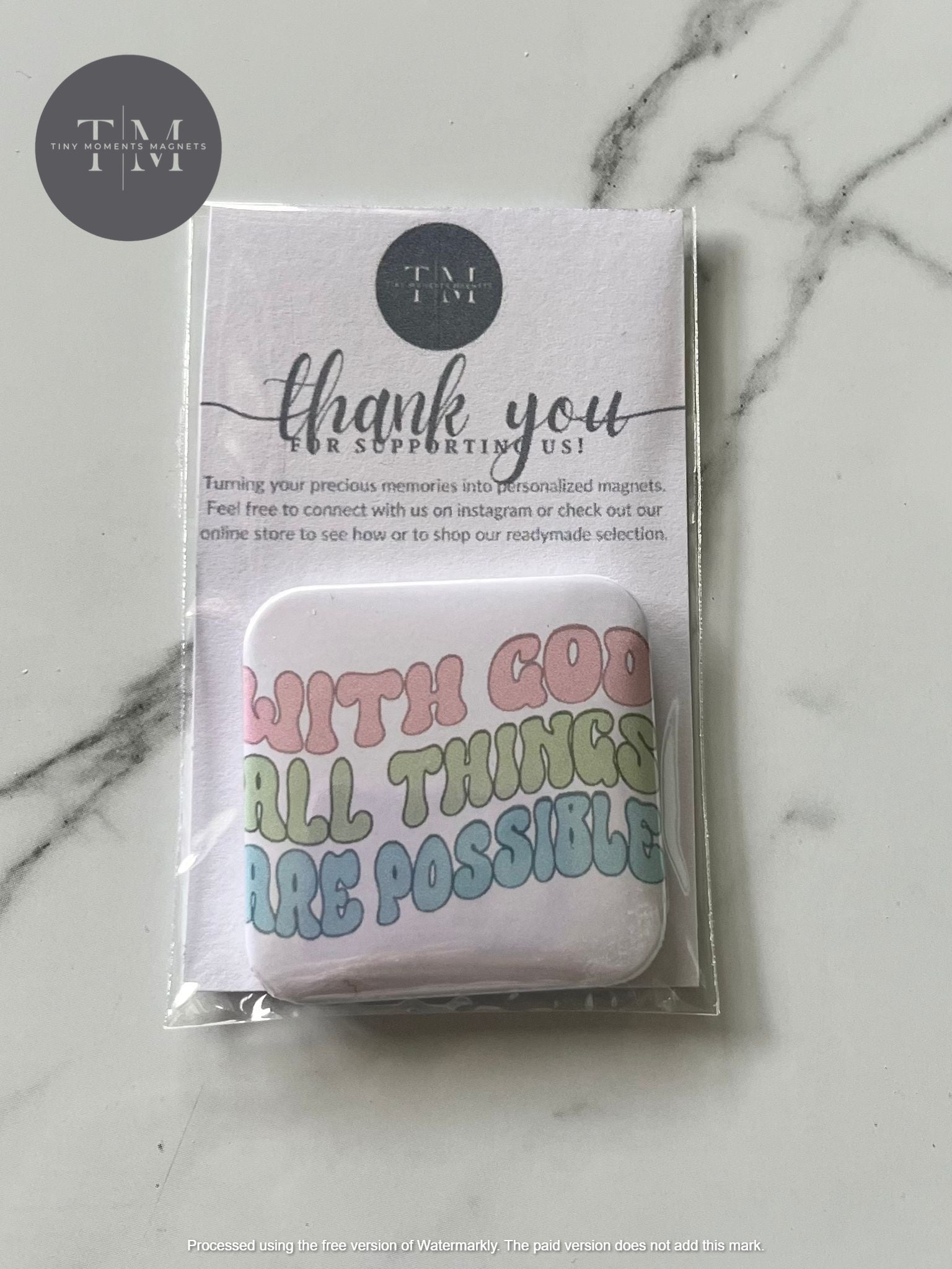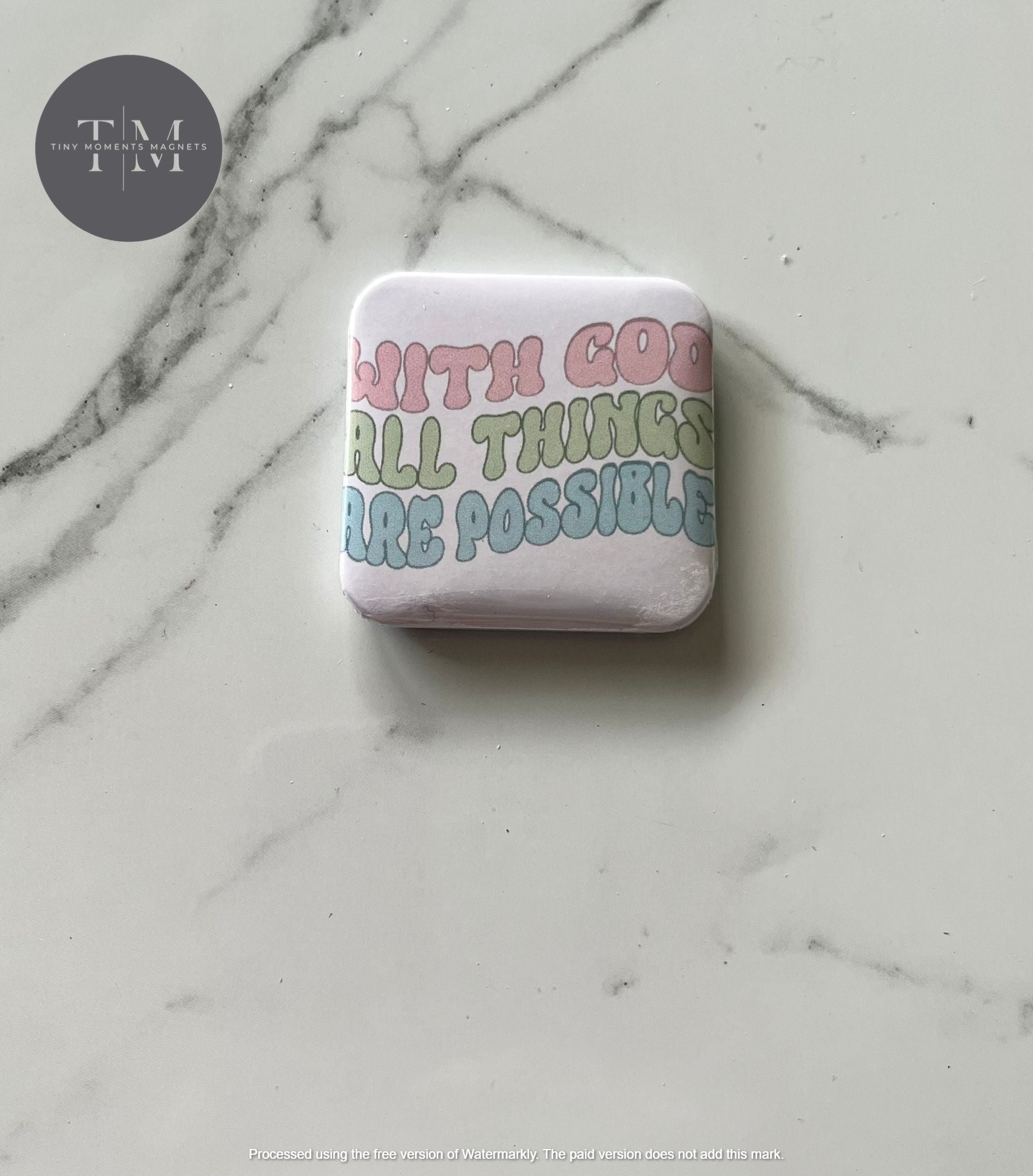 1.5" square magnet of a Spiritual quote : With GOD All Possible